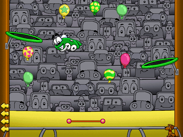 One is a simple breakout-esque game where Putt-Putt can pop balloons, eventually rising to the top of the course by bouncing on player-controlled trampolines. The other is a shooting gallery where Putt-Putt throws pies at clowns that pop onto screen. Neither games have a fail state, and can be quit at any time.