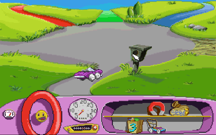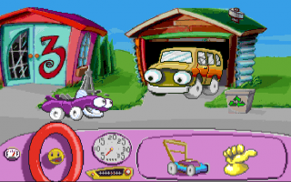 Like in Gilbert’s two Monkey Island games, Putt-Putt lets the player’s goals be accomplished at their own leisure in a non-linear order. The game also offers the player a level of freedom in how they accomplish their goals. Putt-Putt can make his money just by mowing lawns, or by delivering groceries, or through a mix of both, although Putt-Putt will need to mow at least one lawn in order to find a bone and thus recruit his puppy.