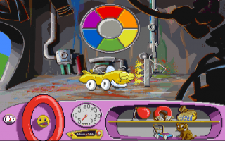 Like most SCUMM games, interaction with the game environment is done entirely via clicking. Perhaps because Putt-Putt’s audience includes children who have not yet learned to read, this is done without the articulated commands of LucasArts games. Players can click on nearly everything in the environment, to varying results. Clicking on objects in the environment lets Putt-Putt talk to characters, pick up objects, read aloud signs, as well as trigger superfluous animations. These animations serve as a way to make sure that each screen of Putt-Putt Joins The Parade is highly interactive, encouraging young players to experiment with it.
