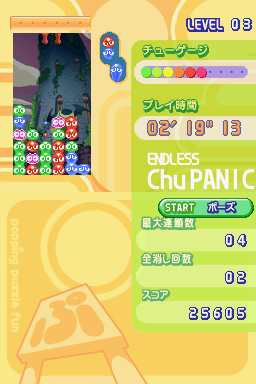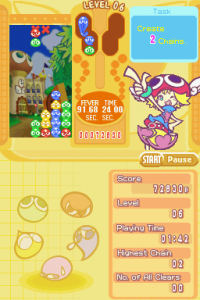 The ports of the game are all similar, and all feature the same endless, mission, and multiplayer modes, though a new addition to the series is that there’s an endless fever mode. In this mode, you’re tasked with getting through as many fever modes as you can before the time runs out, though the time refills slightly after you clear a chain, just like in a regular fever mode. The only time you’ll notice differences is when the DS/GBA ports come into play. Though the other ports have 3D models used for the puyo (and all look the same graphically, a trait that began to carry on in the series), and allow you to save replays, the DS/GBA ports use sprites for said models, and you’re unable to save replays. However, the DS port uses the extra screen for a few things, most notably a four player mode as well as an eight player mode. It also displays the map of the game world during story mode, and uses the touch screen for a few non-mandatory tasks, such as navigating menus. Finally, during battle, there are animations of the players knocking into each other when they activate chains in order to give off the impression of an attack (for a two player battle only). Of course, the DS and GBA ports have a reduced sound quality.