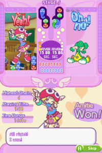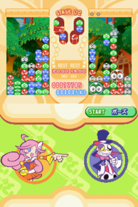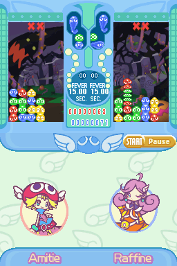 In Fever mode, two very large changes occur. The first is that your board is replaced with a different board that has a preset chain for you to clear. These preset chains always have an “optimal” place for you to start clearing them. The second is that, if you had any nuisance puyo left over before fever mode, they’re held off until fever mode is finished; this gives you time to clear them using the chains fever mode gives you. Unfortunately, your opponent is still able to send over nuisance puyo to you, and if they do so while you’re in fever mode, nothing can save you besides offsetting. What makes this a bit more problematic (and perhaps evens the playing field in the process) is that, although faster, not only are the strength of fever mode chains a bit weaker than regular chains for most characters, but getting a game over in fever mode means you lose the entire match.