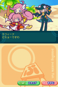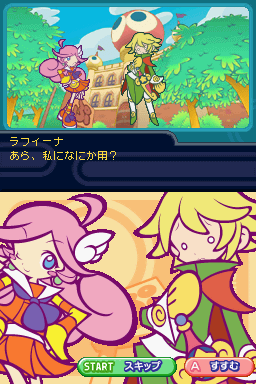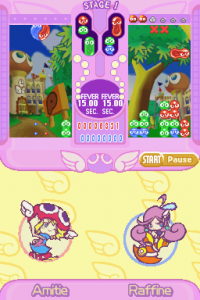 The story of Puyo Puyo Fever is, like the earlier games, quite simple, leaving the game free to not take itself seriously. Ms. Accord loses her flying cane and tasks each student of her class to locate it for a reward – this includes our two heroines, Amitie and Raffine. The story advances pretty much like the older games, where the heroine wanders around the area and encounters different people, so the general flow of a story is still intact. However, the expressive sprite work of the older games is unfortunately absent; instead, characters have a static full-body “portrait” in cutscenes, and animate based on a direct movement to the portrait, or an outright changing of it. Though it still manages to convey some feeling, it doesn’t do it as well as the older games.