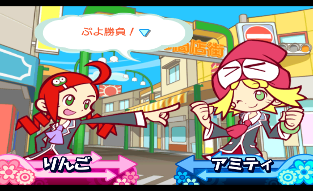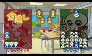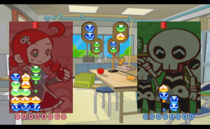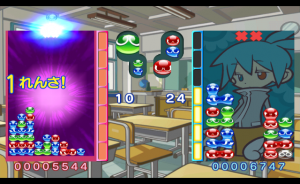 The plot this time around is a bit more detailed than the previous games. Ringo’s school begins to be flooded by puyo, and she must find a way to stop the endless assault of puyo from flooding her world. Along the way, she meets many characters from the previous titles – even a few Compile-era characters (Schezo, Rulue, Satan, Arle and Carbuncle, Draco, and Skeleton T) make their appearance once more as playable characters. Witch and Harpy even show up, though they are unfortunately only cameo appearances and not playable.