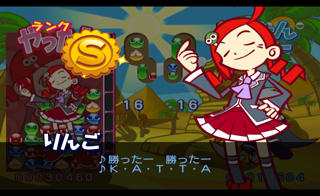 Whereas previous games in the series had you select courses of with a small number differing stages and different characters on top of that, since there’s only one main character here, things progress a bit differently. Instead of having selectable courses, story mode progresses through one continued story, divided into six acts with stages in each. Each stage has its own rule of battle for the match within, given to you before you select it. Much like Puyo Puyo 15th Anniversary you’re given a rank after every stage, and the average of your rank is given after you clear each act (though this ranking is only shown in the options menu). Finally, although Ringo is initially the only character you’re allowed to play as initially through the story mode, you’re able to go back to certain stages and play as other characters once you’ve fully finished the mode. Unfortunately, you’re not able to play as absolutely everyone, and there’s not much incentive for doing this other than witnessing more of the charming dialogue the game has to offer. Still, it’s a small, yet nice touch to encourage replaying the story mode.