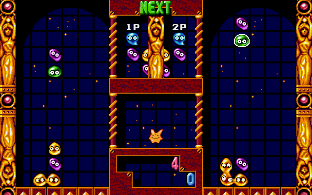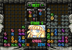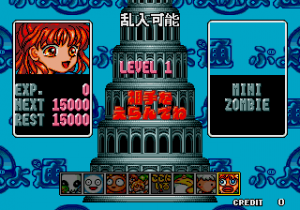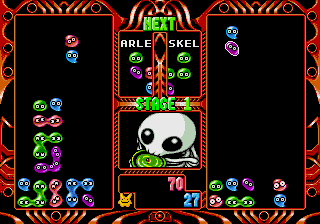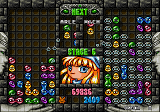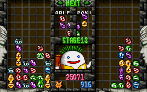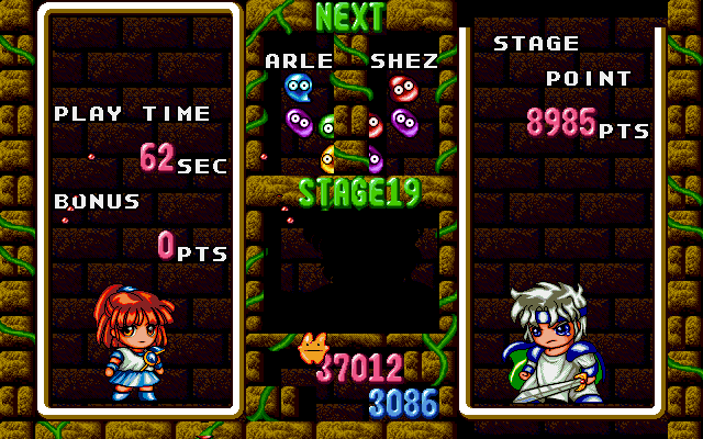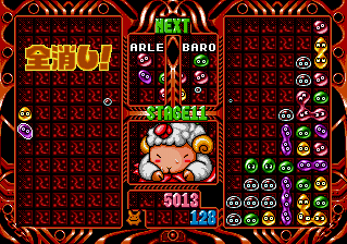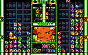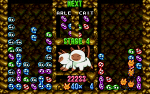 The first Super Famicom version, Super Puyo Puyo Tsuu, ups the ante by offering players multiple stages of play, varying in difficulty, and also doesn’t suffer from the voice problem. It has a few other additions – not only does it have practice mode, but it’s the first game in the series to feature a four-player mode, although it makes each player’s field absolutely tiny. It also brings back the cutscenes, but due to the stage rotation in the standard single-player mode, it’s not as easy to get to see them all.