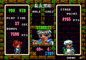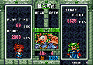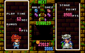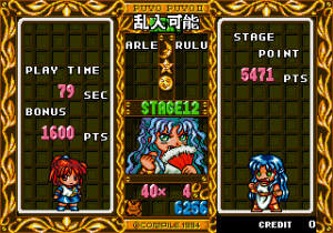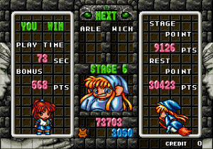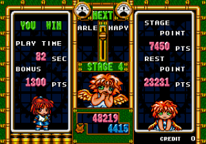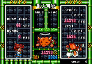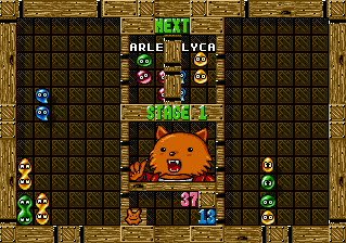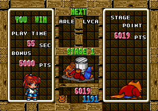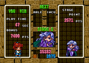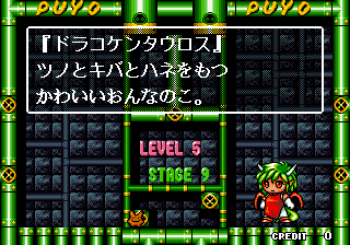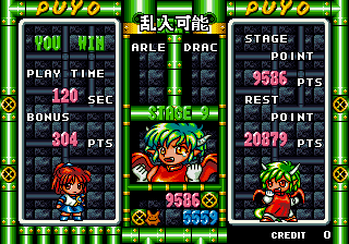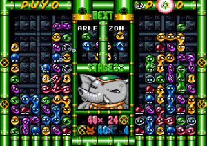 Since the drop speed of Puyo only increases with the amount of rounds, and it’s easy to have a small number of rounds to complete by gaining a lot of points, the game tends to be a little easier than the first one. However, in order to fight the true final boss, you have to go throughout the game without getting a game over, which is quite difficult, to say the least. Unfortunately, the extended campaign comes at the cost of the fun cutscene interactions. Instead of having dialog between two characters like the original game, there’s just a short description of the character you’re facing.