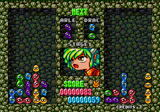 Despite the massive success of Tetris (and general liking of variations like Columns), it took quite a long time for Puyo Puyo to truly leave Japan. There was an English language version for the arcades, but it received sparse distribution. This version features English language voice samples and changes the names of some of the characters. Some are attempts to translate the names into English – Sukiyapotes is Small Foot, for example. As for other examples, Arle is now Silvana, Schezo is now Devious, Satan is the Dark Prince, and Rulue is Lulu.