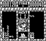 Puyo Puyo isn’t exactly a technologically demanding game, so it only ran into difficulties on the Game Boy. Since the series relies heavily upon colors for distinction between its pieces, and there are up to five different pieces in total, putting it on a handheld that can only display shades of green seems like an unnatural choice. To help tell Puyo apart, some are a shaded lighter or darker than others, and they all have different shapes. However, many of these shapes are quite similar to one another, and since the screen of the handheld is so small, telling Puyo apart can be quite a trial. It’s easy to confuse one Puyo for another and completely ruin a chain you’ve worked on. The game moves at a slower pace than the previous versions, so battles easily feel as if they’ll drag on for too long. The music and sound effects are likewise disappointing, with some being quite grating: the sound effect used for moving Puyo, for example, is a sharp, loud noise, and since it happens so often in a normal match, it’s best to mute the game.