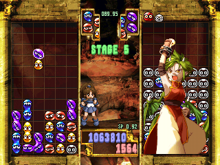 Perhaps the most important change is that all of the special skills have been redone in a furhter attempt to balance out the game. Although a few special skills still center on clearing Puyo, it’s a considerably lesser amount in this game. A lot of skills are now offensive: for example, Schezo’s skill places hard Puyo on the opponent’s grid instead of clearing out his own Puyo in an “X” pattern.