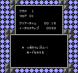 Heading Out is basically the time attack mode, having to complete a certain number of rooms consecutively in order to get a high score. There are 99 rooms, of which any can be selected. Bonus points are earned upon completing a room, starting at 2000 and then decreasing during the duration of the room, along with another timer to track how long you took in the room. After running through the complete set of rooms, the player’s score is put on a four-slot leaderboard. Vs. Mode is basically a race version of Heading Out between two players.