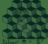 The first of two new Q*bert games arrived for the Game Boy early that year. It was a much more traditionalist effort than Qubes, using the exact same core mechanics as the 1982 game. The main difference comes with the changing stage layouts like in the MSX game, but they’re nowhere near as adventurous. Since the 64 arenas don’t fit on the Game Boy screen, it’s possible to pause the game to have a look at an overview map. Even though enemies are not shown on the map, this allows to analyze the current situation at leisure, which takes out much of the frantic pressure that made the arcade games so exciting. With the varying stage layouts, enemies can appear at very different positions each time. To prevent the game from unfair trial and error, their appearance is announced beforehand by a blinking crosshair. The only new type of enemy is a drop that goes up and down the structure and never falls off, but it is deleted together with all other objects when Q*bert traps a Coily. Every once in a while, fruit comes dropping down that can be picked up for extra points.