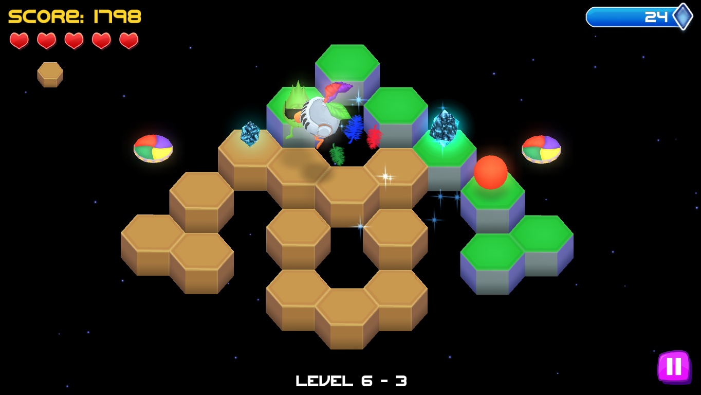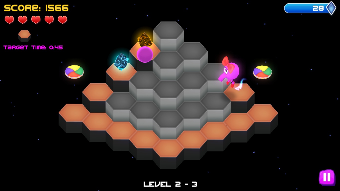 The bonus rounds may well be the most interesting part of the game, at least at the beginning. Here Q*bert has to collect crystals that are scattered around the board within a very strict time limit. There’s never enough time to get all of them, so they require quick thinking to find the most optimal path over the pyramid – or it would require quick thinking, if success in these stages mattered at all. The crystals are the game’s currency to unlock stuff, but there’s not much stuff to unlock. All there is are six alternatives skins for Q*bert: Q*zard, Q*bertha, Q*bot, Q*zilla, Q*tee, Q*knight and Q*nicorn. Some are just silly costumes, others vaguely based on former Q*bert universe characters, like Q*bertha and Q*tee. But they look nothing like their unique original appearances, and they’re all little more than skins grafted onto the standard Q*bert model. The choice of costume makes no gameplay difference at all, either. When going for the first star in each level, every crystal picked up is just worth +1, but with the second and third star, +3 and +6 crystals get thrown into the mix. It’s easy to unlock all costumes by about 1/3 of the game, and afterwards the counter just keeps running towards infinity for no good reason.