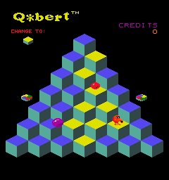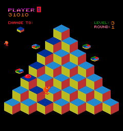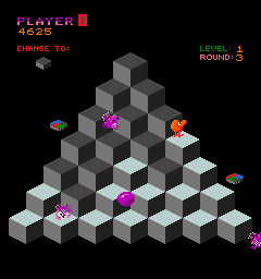 Q*bert starts out fairly easy and takes a while to ramp up the difficulty, but then it becomes very hectic and hard to keep under control. Unfortunately, that means that after a few hours of practice the first couple stages get a bit boring, and as soon as things get interesting, the game can be over fast. The PCB has a dip switch that allows to skip rounds, but that also grants unlimited lives at the same time. An in-game level selection would have been more desirable. The game also gets rather predictable, as enemies always spawn from the same few spots and have very limited (though randomized) movement patterns. Regardless of the changes in color swapping patterns, all stages still take place on the same pyramid.