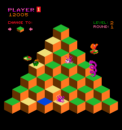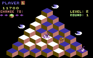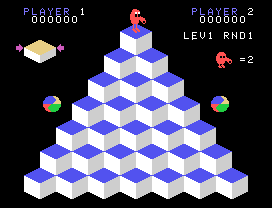 Q*bert’s task in every stage is to hop on all the pyramid blocks to change their color to a target. This starts fairly easy when every tile has to be stepped on just once, but eventually grows more challenging. After every four rounds, Q*bert reaches a new level, which further complicates the rules. First there are tiles whose color has to be changed twice, then they revert back each time Q*bert passes over them again, and finally the two concepts get combined in varying forms. Thus the game gradually grows from a pure twitch-action affair into more and more of a puzzle game. In the higher levels it’s easy to end up with a seemingly (on first look) unresolvable leftover tile, and getting quickly through the stage requires clever planning.