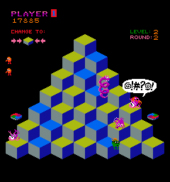 Part of Q*bert‘s appeal in the early 1980s was its audiovisual presentation. The sprites are adorable, and the bright colors make it stand out from most of the contemporaneous crowd of arcade games, but it was the sound that really sold the game. The swearing allegedly came from Gottlieb’s sound engineer David Thiel experimenting with synthesized voice, but since he had a hard time getting it to produce any intelligible speech, he just made the program blurt out gibberish based on random parameters. The result became one of the character’s trademark characteristics, and was used or imitated in the cartoon (where Q*bert speaks normally otherwise) and most of the later sequels.