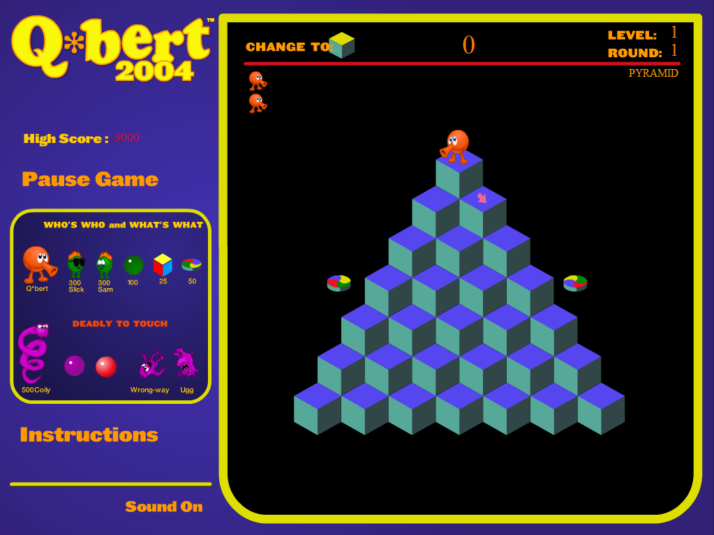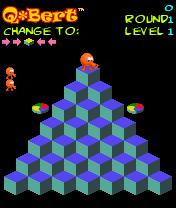 It took ten more years until Hasbro Interactive revived the franchise. The new game that was also labeled just Q*bertfor PlayStation, Dreamcast and Windows PCs contained a classic mode that recreates the arcade game, either with 3D graphics or the original pixel art. Several versions of the Flash sequels Sony Pictures put out in 2004 and 2005 also contain the original arcade game, sometimes with newly drawn sprites, sometimes with the old graphics. All these versions support mouse controls, but those feels really weird with Q*bert even though they technically work pretty well. Worse is the terribly slow pacing. At least Q*bert 2005 was also available as a Windows executable. Afterwards, Sony brought Q*bert to a range of download platforms, including Java-based mobile phones, the iPhone and PSN. Most of these were just the basic arcade game again (although the iOS port also offered some of the added content from the Flash games). But those have all been delisted off the respective services, so the only ways to legally play Q*bert – short of acquiring the arcade machine – involve to either track down any free versions of the Flash games, or get one of the old imperfect ports.