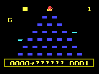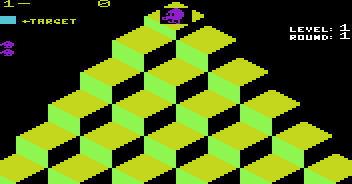 Parker Brothers (Montezuma’s Revenge) secured the license for home conversions, and did their usual near-complete sweep of the available platforms at the time. The port for the Odyssey² was naturally very crude, and the floor tile are represented by simple rectangles. With the Escher look gone, Wrongway and Ugg end up simply moving around the same surfaces as everyone else. There are also some weird balancing changes. Round 2, for example, introduces all the enemy types at once, while in round 3 Q*bert almost has enough time to clear all tiles before even one ball spawns at the top of the pyramid. The Atari 2600 version does display cubes for the floors, but they still look nothing like an Escher painting and are oddly spaced. Wrongway and Ugg don’t appear at all here, but without them, the game gets a bit monotonous. The pyramid consists of only 21 tiles on 6 floors, compared to the original 28/7. This feature is shared by the Intellivision and Commodore VIC-20 ports. The Intellivision manages an otherwise reasonably similar look to the arcades, but the VIC-20’s lack of proper sprite capabilities means that it runs and looks terrible.