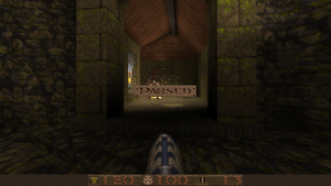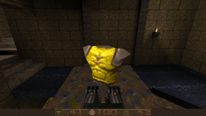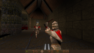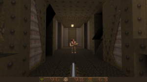 Fundamentally, the game plays much like DOOM or most of other first-person shooters of the mid-90s, entirely around key hunts. The weapon set is stripped down a bit, though. The pistol is out, having been replaced with an extremely accurate shotgun. A double barreled super version also exists, and the chaingun has been traded for the nailgun and super nailgun variant. These fire projectiles instead of just being hit scan damage dealers. The rocket launcher is still present, but the plasma gun and BFG have also been replaced by the grenade launcher, able to shoot grenades off walls to get enemies around the corner, and the thunderbolt, a stream of electric pain that can do a ton to those it hits. With the rocket launcher, you can “rocket jump”, a technique executed by firing downwards with an explosive and using that force to propel you higher than you’d normally be able to jump. You have to be careful with this, since it does technically cause yourself damage, but if you pull it off correctly, it’ll be minimal. If you fire the thunderbolt into water, it’ll electrocute anything swimming in it…including yourself, if you’re careless. The expansions Scourge of Armagon and Dissolution of Eternity also add some goofy stuff, like a mine launcher, a grappling hook for deathmatching, and hilariously, John Romero’s much desired magic hammer.