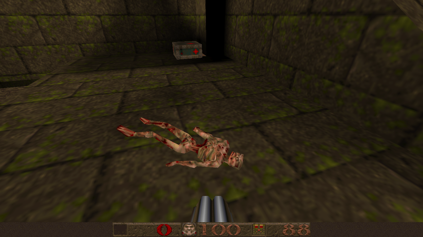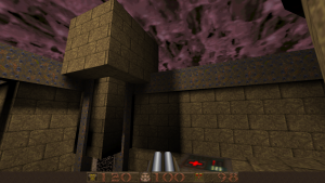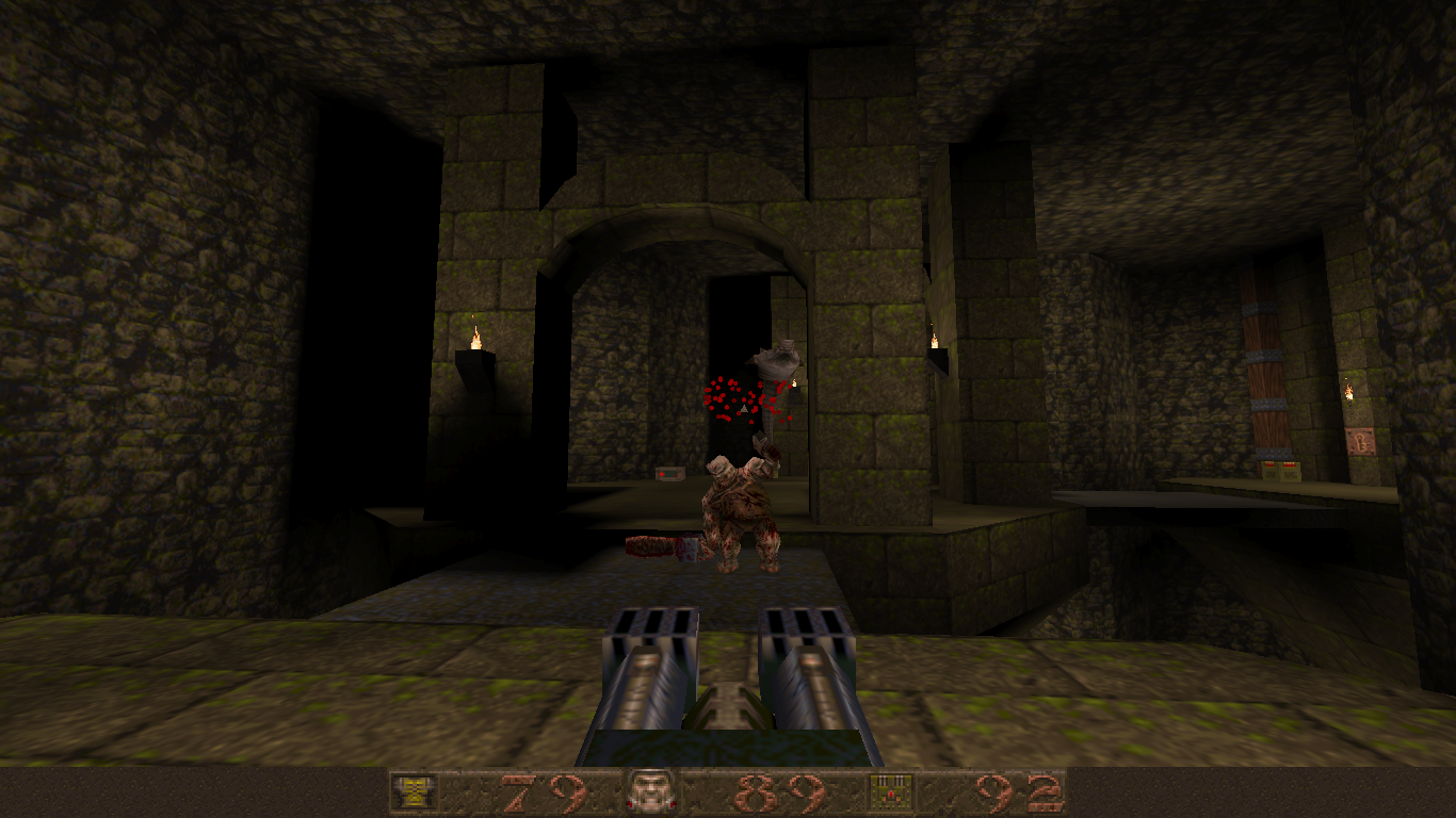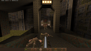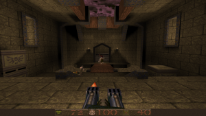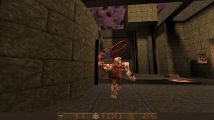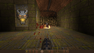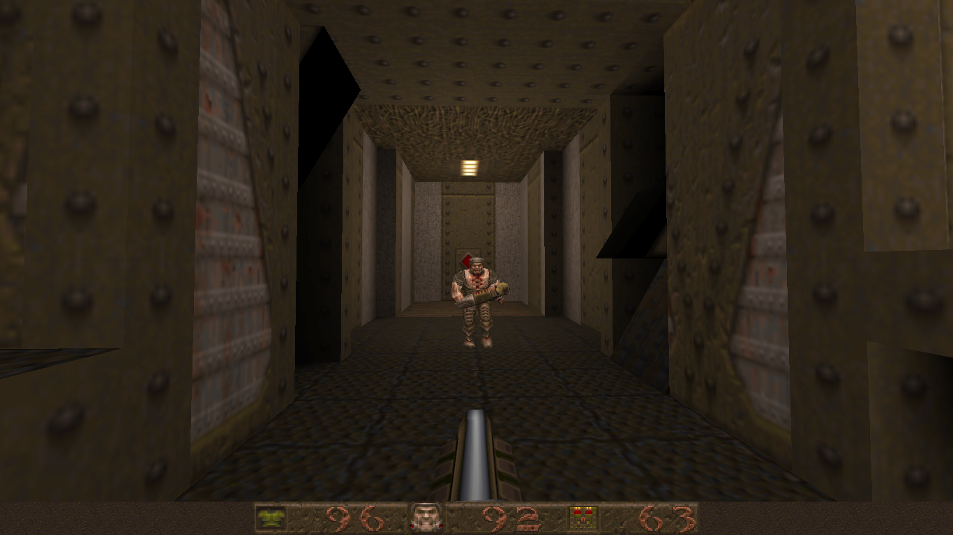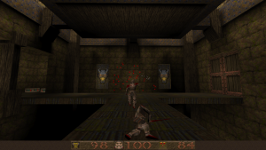 Like DOOM before it, Quake also changed how FPS games were designed through technological advancements. Games like DOOM were referred to at the time as not being “true” 3D, because while you could create areas of various heights, you couldn’t, for example, place a room on top of another room. The Build Engine had a similar limitation but got around it with assorted trickery. id Tech 2 eliminates this limitations, and the worlds are now completely 3D, adding in a new level of vertical freedom. Being able to move the camera up and down was a game changer (though games like Heretic and Duke Nukem 3D experimented with it mildly), and every single modern FPS owes what id did here a great deal of gratitude. You can properly jump now, too, plus more realistic movement physics. There’s also water, where you can swim up and down. Also new is more robust lighting features. DOOM allowed maps to have individually lit sectors, but most actual effects, like shadows, were faked and built into the level designs. Quake, on the other hand, has lightmaps and 3D light sources which is evident in the glowing of your weaponry.