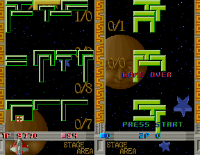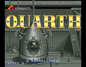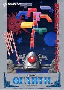 Quarth is a fun little shooter / puzzle hybrid from Konami. You control a small ship at the bottom of the screen as blocks fall from the top, sort of like Tetris in reverse. Your ship shoots tiny blocks, one by one, to complete the shapes and turn them into rectangles, at which point they disappear. Creating bigger rectangles not only yields more points, but pauses the game briefly while they’re being cleared, allowing you to work on other parts of the screen. You can also hold upwards to increase the speed of the block’s descent.
