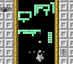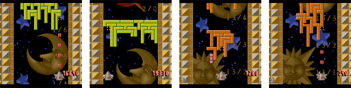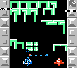 The Famicom release lets you play as both the winged pod and the Block Hole ship. It also includes the ability to choose your area (difficulty level) from the start, as well as an additional two-player alternating mode. Certain colored blocks also have different effects that can grant extra points, temporarily freeze the scrolling, apply a double score multiplier, or destroy all of the bricks on screen. The graphics are very sparse, with only a black background, but the palette changes every new area. This is the only version of the game that gives you lives, though you can continue in other ports. According to the Famicom manual, the winged pods are named Ding and Dong, and the ships are named Square I & II.