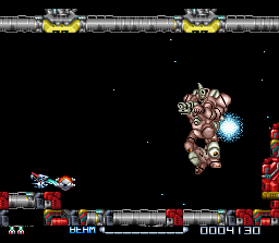 There’s quite a bit of excellent music, too. The Force selection screen, viewed from the perspective of the R-90 pilot as he rockets through space, gets you pumped up and ready for battle. The first stage theme is a remix of the first level theme from R-Type, and greatly extended. The only downside is that it overuses a particular distorted guitar sample which makes the entire soundtrack feel uniform.