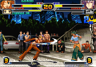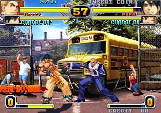 The fighting system is pretty standard for an SNK fighting game. The four buttons are used for two punches and two kicks – typical but different from the previous Double Dragon fighting game – and there are KOF-style rolls. There are sixteen characters in total – most of them are paired off with other characters for storyline purposes, but you can mix and match fighters however you choose. It’s a tag-team game, and a fast paced one at that, so it feels a little like the Marvel Vs. series, right down to the ability to pull off combo attacks with your partner. You also have the ability to “surrender”, which will cause the current character to quit the fight and sacrifice their remaining health to the other tag partner. There’s also a “launcher” attack, which will fling your opponent across the screen, and let you execute a precanned combo, with the button commands helpfully illustrated at the bottom.