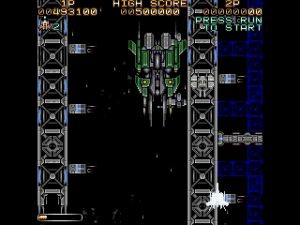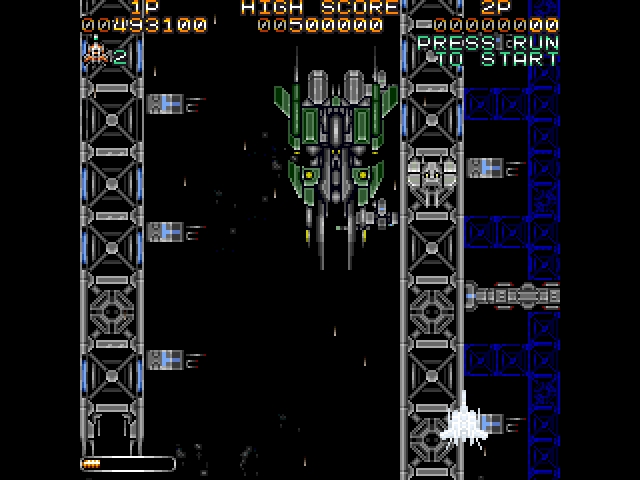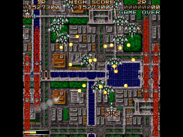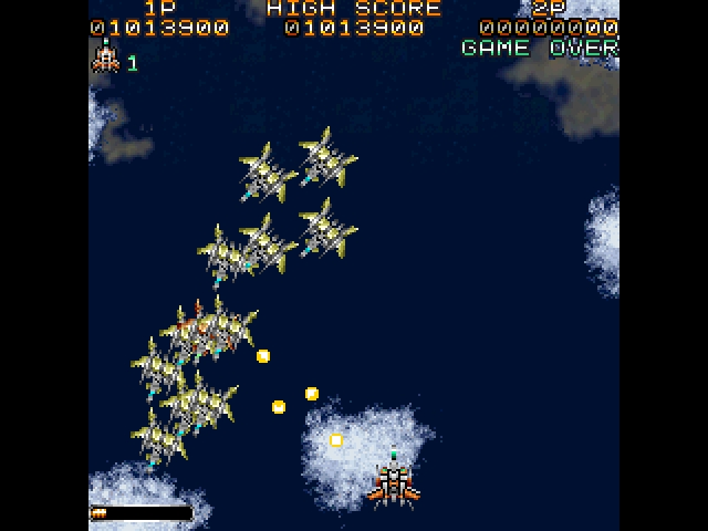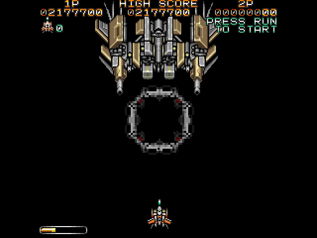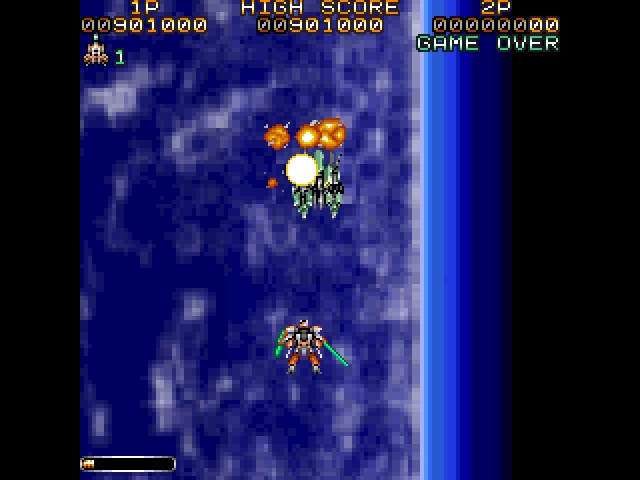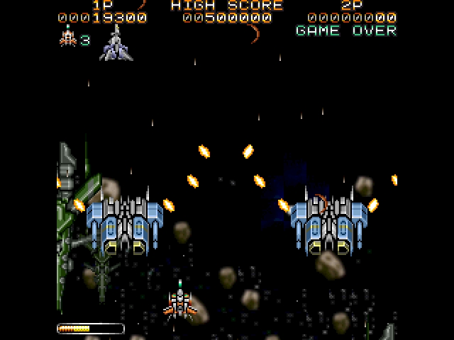The game system is also very similar to Second, the player’s fighter already had its unique dual combat system with weak but fast rapid/homing and powerful but slow sword/laser combinations. This time though the powerup/health system is radically different – while there is a slowly charging power bar, it only governs the homing/beam laser. The rapid fire gun is instead upgraded via powerup items dropped by orange enemies, which is somewhat similar to KAMUI. While it can get pretty powerful in its own right, the powerup items serve another crucial role – as long as the player has collected at least one, the first enemy hit will not destroy the player’s craft, but instead reduce powerup level to zero. This makes the game relatively forgiving as it is possible, at least on lower difficulties, to just coast from powerup to powerup, relying on the ship’s other, powerful weapons. On Normal and above, however, it will definitely not be enough due to a combination of various factors, especially how sluggish the blade mode is, and how blazing fast enemy bullets get, requiring sharp reflexes and focusing on fighter mode just to survive.