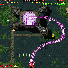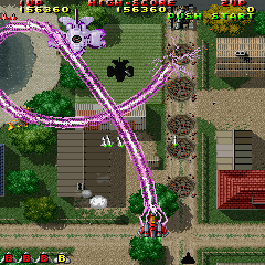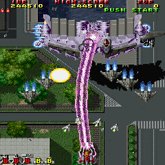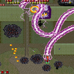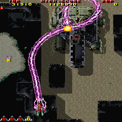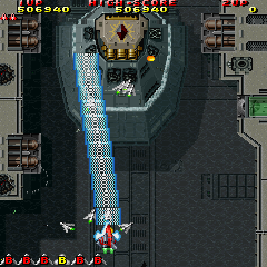 As in the first game, you get either a wide shot or straight laser for your main weapon and either napalm or homing missiles for your secondary weapon. Raiden II introduces a third main weapon that is one of the most badass armaments in shoot-em-up history. The icon for it is colored purple, and it starts out shooting a quick stream of lasers before merging the lasers together into one long completely unbroken plasma beam. Affectionately dubbed the “toothpaste laser” by shoot-em-ups.com, this long purple rope of death sways as you move left and right to sweep over fodder. If you hit a large enemy, the plasma beam locks onto them and drains their life to nil. Any other enemies who touch the beam while it is locked on will still take damage. Sometimes, the beam grazes multiple targets at once, bending and looping around several times, eclipsing the terrain below in curls of purple death. This is a really damn cool weapon, albeit more difficult to properly use than the red or blue ones.