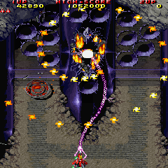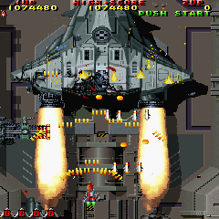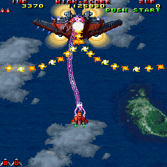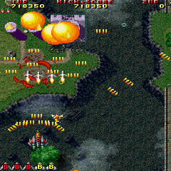 Even with just one player, the game is a hell of a challenge and a well-designed shoot-em-up without any prominent faults. Naturally, having a second player makes it kick even harder, particularly as you can still combine your firepower to shoot off incredibly damaging yet unpredictable starbursts that fly around every which where. A small difference that player two has between player one is starting out with three yellow cluster bombs as opposed to three red nuke bombs. Raiden II is all the first game was and then some, and the two-player experience makes it just that much greater. Though Raiden II may be better than the first, it is unfortunately relatively light in home ports compared to the original.