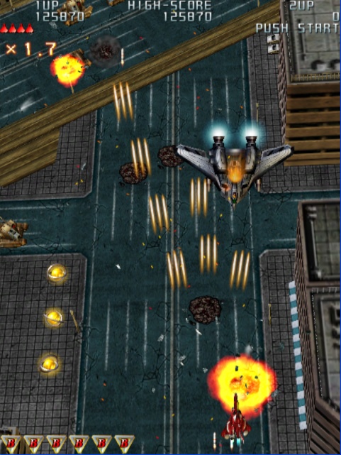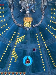 The bomb itself is meant to be used more defensively than offensively in accordance to the ridiculous new pace of bullets that will likely fill up the screen. As usual, the game starts out reasonably kind until about stage 3, where the insanity level reaches a maxim far more insane than to what old-school Raiden players are used. Make no mistake, Raiden III is officially a bullet hell, crossing the line on which Raiden and Raiden II bordered upon back in the day. The bullets are numerous and travel fast, especially prominent in the boss fights but even noticeable among regular enemies near the endgame. The ship’s hitbox is also subtly smaller than previous installments, requiring you to really wedge the ship in between waves of orange and yellow death. The game feels less like Raiden and more like a typical danmaku shoot-em-up, not really fitting to how the series has been up to this point. The Raiden Fighters games got a bit nuts, but they didn’t feel like they required bombs to be fired every five seconds to shrug off enemy fire.