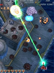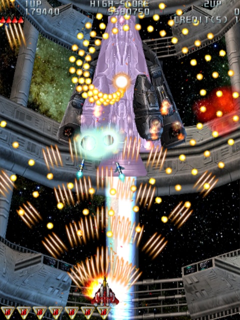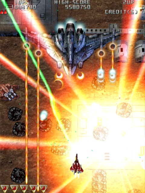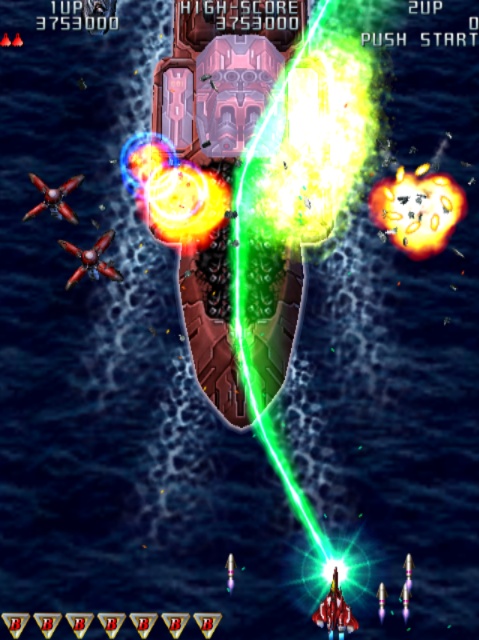 Dubbed the “Proton Laser,” this green weapon is an unbroken stream that sways around like the old Plasma laser but does not lock onto its targets. Without the lock-on feature, the Proton weapon is an inferior version to the more powerful (but less controllable) blue laser. At least the red and blue weapons are more or less the same, though the red vulcan shot starts out with a slight three-way spread, giving you a bit more edge every time after you die. Furthermore, there is a new type of missile alongside the classic impact and homing missiles. The Radar missiles act as a combination of the two, where the missiles fly forward but adjust their trajectory to hit the nearest enemy. The bombs are also somewhat different; instead of dropping a large nuke in a concentrated area, the bomb here simply wipes away everything on screen, bullets and minor enemies alike. Sadly, the cluster bomb from Raiden II / DX is not present.