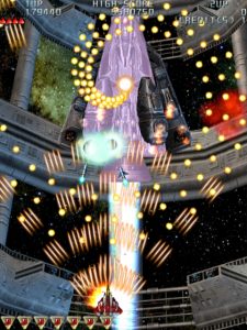 If nothing else, the bosses at least look reasonably cool, though they’re not quite as varied as the bosses from the classic games. In the tradition of the older games, the first boss appears to be a giant tank with what seems like a large six-shooter shaped multi-missile pod, but another one just like it comes into the first several seconds later. The bulky sixth boss starts off by dropping annoying large spheres that are tough to shoot through, and when you think you’ve destroyed it, it sheds its outer layer and spreads wings before challenging you again. The last boss is the obligatory heavily armored Crassanian head fortress, and as in Raiden II, the red diamond which appears to somehow be the leader of the enemy pops out and assaults you in a fashion similar to the final boss of Radiant Silvergun.