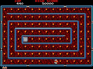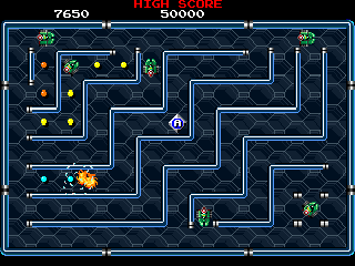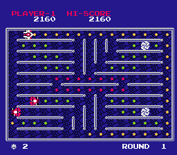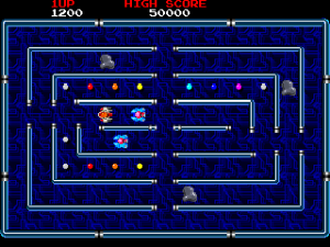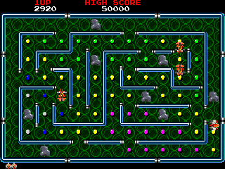 The standard labyrinth enemies are a mix of characters primarily rooted in variations of insects, other vehicles and colored blobs. Like Pac-Man, each enemy has its own characteristics that a player will quickly learn as they encounter them more and more. Pink ships will follow the player at high speed, green bugs will jump around the maze walls, and one particularly devious enemy mirrors your movements while dropping more dots to pick up.