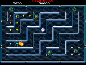Power-ups also appear randomly beneath collected dots, with eight types in total. “S” slows enemy speed, an important pickup, while “B” (“break”) provides a quick exit, opening doors in one direction of the map. As you progress, find the red “L” laser that you can use to destroy enemies, and blue “A” (“Arm”) shield (providing up to four levels of protection for the Organizer). Other power-ups appear less frequently but are more powerful. The “C” (“Crash”) power-up instantly clears any uncollected energy plates from the board, “P” (Player Extend) provides an extra life and the “R” (Rainbow) provides a random effect, granting powerful armor, clearing the entire level, or some other form of temporary overpowered boost.