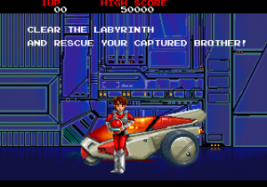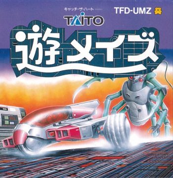 The only contemporary port of Raimais was released for the Famicom Disk System, where it was renamed Youmais (sometimes spelled “Yuu Maze”). There are a number of changes, primarily in the way your cycle controls. In the arcade game, there’s no way to stop it, but here you can speed up and slow down as you please. The acceleration speed is also slower, as it takes a few moments to reach top speed. The stage designs are different, and there are only two exits per level instead of four, though you need to play a whopping 50 stages rather than 32 to reach the end. Many of the cinema scenes are gone, too. There’s no mirror to find, with the ending contingent on whether you can protect Makoto from Mr. Molto’s laser blast in the finale. The boss fights in the arcade game have been removed as well, replaced with timed challenges where you need to collect a certain number of dots or defeat a certain number of enemies. The giant insect robots are shown on the cover art, but do not actually appear Youmais.