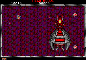 Beyond the power-ups and boss fights, the other main distinction of Raimais is its level branching. Once the stage is cleared, then eight gates open up on the sides of the level, providing access to the next level. The direction you take determines the next stage, each assigned one of four different colors – Red, Blue, Green, and Gray. As you move from level to level, the screen scrolls into the next scene with a stylish transition that shows the surrounding world, which looks like part-skyscraper, part circuit board. There are 125 different boards in total (the first stage, and four colored variations of the next 31 stages) though in a regular game, you’ll only play 32 of them max.