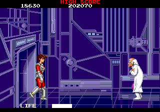 Every once in a while, you’ll be treated to brief cutscenes. In these, Rika encounters a monitor showing the visage of the evil mastermind. Dr. Molto. He’ll taunt you in digitized Japanese speech, with his monologues changing depending on your performance, which is pretty impressive for a game from 1988. If you cross past certain stage thresholds without dying, you’ll also warp forward four stages. When completing Reverse Rounds, you’ll meet Gum Can, an ape-like creature with a goofy sense of humor who gives vague hints and sometimes some power-ups.