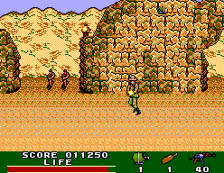 Unlike the previous Rambo game for the Sega Master System, this is a shooting gallery-style game that requires the Light Phaser. You have a limited supply of machine gun bullets, so you can just hold down the trigger to mow down bad guys. Once you run out, you need to resort to single fire shots. You also have a single grenade to kill everything on the screen (including civilians) and a power drink (which looks like a beer bottle) to replenish your health – both are activated by shooting at the icons at the bottom of the screen. It’s a really frustratingly designed game, because multiple enemies will pop up at once, all draining your life meter at the same time. It’s impossible to completely escape damage, it’s just a matter of reducing it as much as possible. The digitized graphics used in the intro and intermissions cinemas are the only thing that seem to tie this into Rambo – otherwise, it just looks like an Operation Wolf clone.