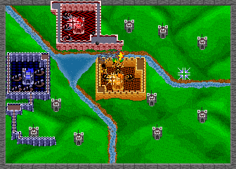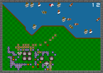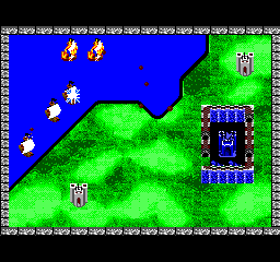 The Game Boy version is one of the stranger versions of the game, although not quite to the extent of the Famicom version. You’re given the choice of three different characters upon starting a new game, which supposedly determines the strength of your cannons and defenses. Unfortunately, it’s hard to notice what actual difference this makes in gameplay. This version also has you shooting at soldiers, knights, and moving towers. They don’t behave much differently than the ships, except that they move around more randomly, which makes them far tougher to actually hit. To make up for the Game Boy’s small screen, your castle and the surrounding land is kept on one screen, while all the enemies are contained on a separate screen you have to scroll the cursor into.
