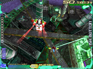 The biggest addition to RayCrisis‘ Playstation version is the new “Special Mode,” which is a throwback to early ’90s PC Engine shooters like Super Star Soldier that would feature score attack modes. You only have one continue in Special, but to compensate, your ship is constantly at full power. Targets that normally toss out power-ups instead generate crimson spheres which lower your Encroachment gauge, as well as bonus lives that prolong your current score bender. To ensure that your run isn’t a total breeze, you must play EVERY stage back-to-back, including a new level called “Judgement” that serves as your final test before the end battles against Dis-Human and Infinity. Furthermore, your Encroachment meter fluctuates wildly and often risks coming close to 100%, though you only lose major score points if it does this. Regardless, it is in your favor to keep that gauge low by getting those bonus spheres.