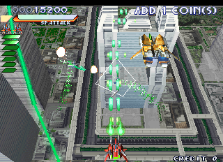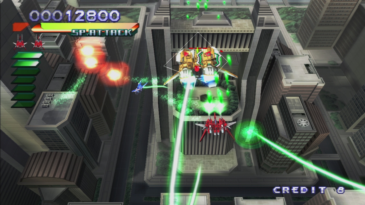 It retains the Extra Mode, arranged soundtrack and customization options. The R-Gray 0 is present too, and now looks more like the X-LAY from the previous game instead of a recolored R-Gray 1, but it even adds a fourth ship named the R-Gear, the same name of the abandoned prototype sequel to RayForce. Interestingly enough, it looks like a normal-sized version of the sixth boss, including two satellites whose lasers act as lock-on attacks while the main ship fires out a stream of missiles with semi-homing ability. While the graphical touch-ups and the new fighter seem a bit paltry to an update for a game more than a decade old, it still is better than just lazily porting the home console versions straight up and make it the definitive and most easily accessible version of the game.