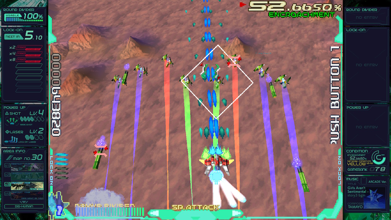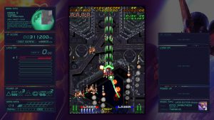 This finale takes place inside of a supercomputer, as you control a ship that’s essentially a virus attempting to infiltrate it. While it looks and plays similar to RayStorm, it features a unique structure – after the first stage, the game randomly chooses the next three levels (out of a pool of five) before the encounter with the final boss. An onscreen Encroachment meter decreases when you destroy enemies but increases if you let them fly off the screen, eventually ending the game earlier if you let it increase to maximum. Conversely, you need to fulfill other requirements if you want to get the true ending.