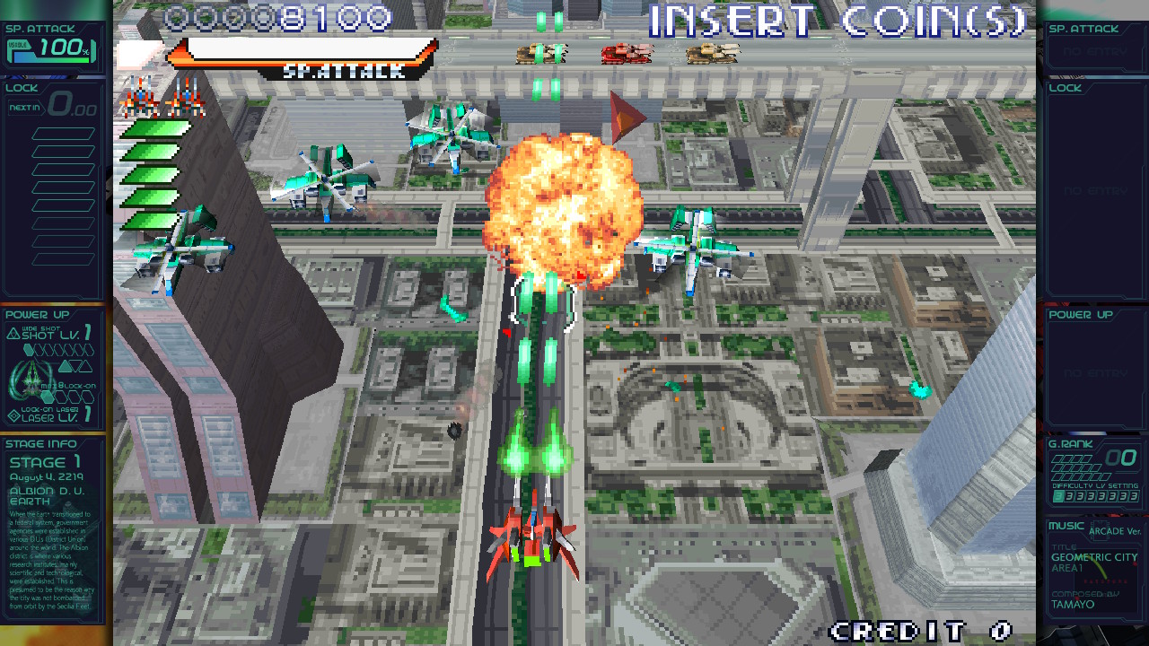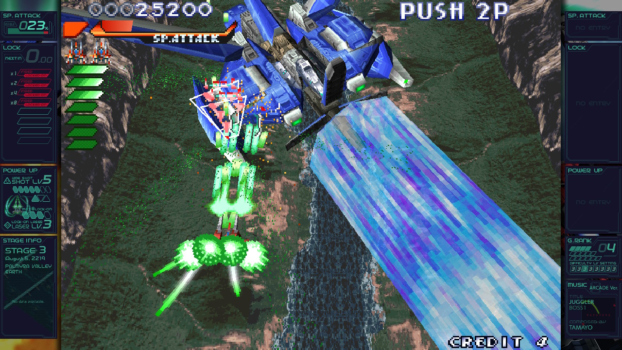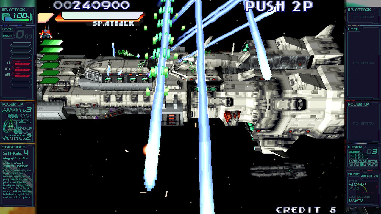Unlike the previous two games, RayCrisis wasn’t ported quite as often, receiving only a PlayStation port as well as an Android/iOS release. The PlayStation version had a number of changes to make it more suitable for home play, particularly the ability to choose the order of the stages and unlocking the hidden third fighter from the outset. Since this release is based on the arcade game, you either need to unlock these through repeated plays – the game keeps track of player data through their initials – or by entering cheat codes. It’s missing the extra mode from the PS1 port that put all of the stages in order, and also lacks the extra fighters from RayStorm. On the other hand, it does include an arranged soundtrack taken from various arrange albums. Much like RayStorm, an HD mode is included for crisper visuals. Even though it’s missing quite a bit from previous ports, at least it includes the two-player mode, which was excised from other releases.