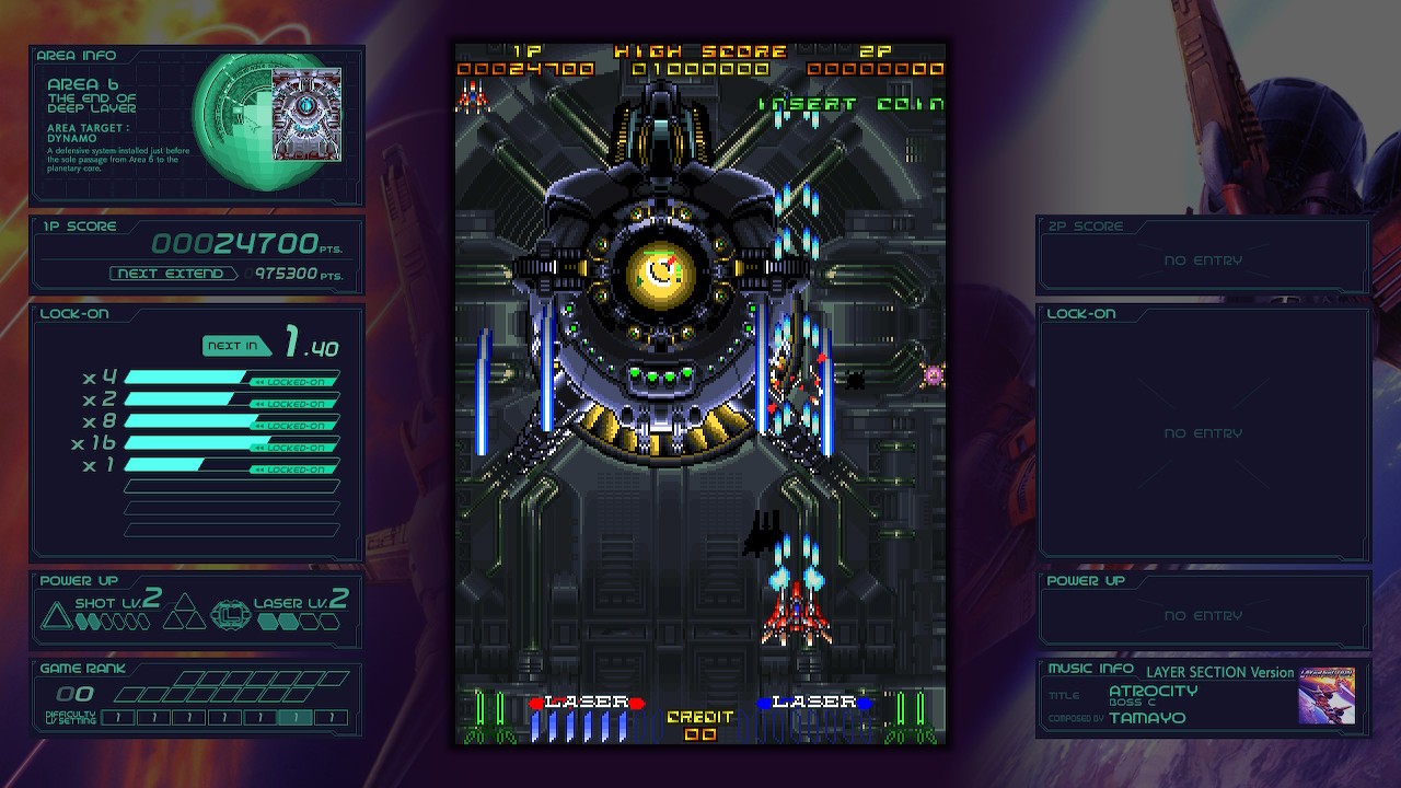 Released in 1994, this game was also known as Gunlock in Europe, as Layer Section on the Japanese Saturn, and Galactic Attack on the American Saturn. Running on the Taito F3 arcade board, it features some truly gorgeous scaling effects, depicting your ship’s descent from outer space, all of the way into the core of a planet. Developed for a vertical monitor, you can also flip the orientation sideways, which is especially handy playing in portable mode on the Switch. Also included is the music from the Saturn version, which features a slightly enhanced stereo mix.
