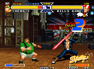 Very few changes have been made to the basic gameplay, but what has been changed has greatly improved on an already excellent game. Recovering from a knockdown is still possible, but only after H. Power is activated. Ring outs have been removed entirely, but there are still walls to destroy in each stage except Geese Tower. If a wall is destroyed, opens up a slightly larger playing field. It’s sad that the amusing ring outs from Real Bout are gone, but there are still some nice touches, like the panda bear in Tung Fu Rue’s stage that gets pissed off if the combatants bother him.