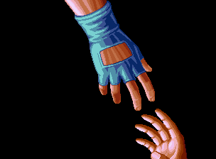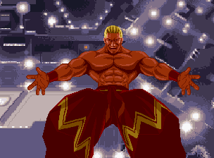 In every arena other than Geese Tower, it is possible to destroy the side of the stage. All walls can be damaged when a character is knocked against them (whether or not they block), or by attacks that miss the opponent and collide with a wall. Any damage to walls is retained after each round. When a wall is destroyed, it reveals an out of bounds area. If a fighter is knocked into it, they’ll lose by a ring out, similar to Virtua Fighter. Some of these ring outs are pretty funny. In the subway stage, the combatants can be knocked onto a train, which then departs, spiriting them away from the fighting ground. In the museum stage the destination is an elevator, which then carries the losers upward as they hop furiously. When Blue Mary is knocked into the water in the docks level under the right conditions, she’ll surface without her top, which is one of the very few instances of actual nudity in an SNK game.