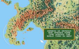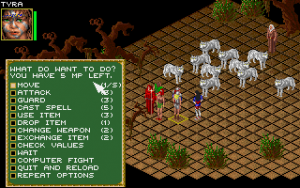 Signposts mark exits out of town, and walking into them accesses the travel mode, which makes up a good portion of the whole game. Traveling takes place by foot and by boat, though the former is the standard form of movement. Here it becomes clear how simulation-heavy Blade of Destiny is. The party has to rest every night, take care of food and water, assign guards for the night, and so on. The mountain passes can’t be traveled during winter, and not dressing properly for the season is likely to get someone sick. There are also a lot of random and fixed encounters, some useful, others dangerous, yet others simply annoying.