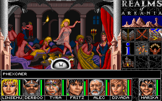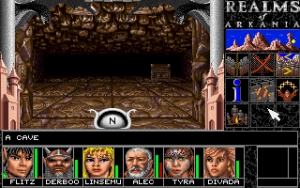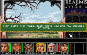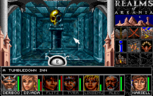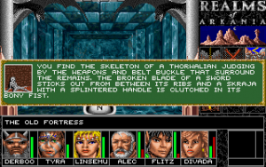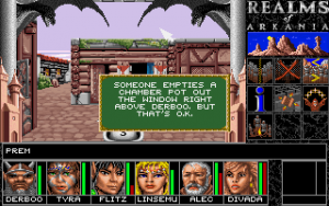 It is essential to take notes of every hint given. The game keeps an automatic diary, but that is completely useless. Walking aimlessly through the world doesn’t get a party very far, as there are about 50 towns in the area, and most of them are of no direct use to the quest. In fact, a lot of them are of no direct use to anything. There are some random encounters in the towns as well, but most are there just for fun and without any consequences, aside from the occasional pickpocket. If a town holds a temple, it can be used to save the game without any drawbacks, as saving in any other location reduces each hero’s EXP. Usually, it is also necessary to sell loot in the first reachable town after any dungeon raid, as inventory space and carrying weight are strictly limited. Especially items like necklaces or rings are heavy on the space, as there are no separate equip slots for them. However, players who get rid of those magic items will regret it in the sequel, when this problem gets solved. It’s also possible to earn money in bars by cheating in a gamble, doing acrobatics or playing an instrument (pickpocketing isn’t implemented, yet), but usually just selling off all the stuff pillaged from dungeons and enemy encounters provides much more funds than needed.