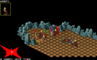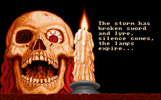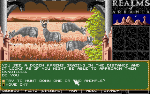 Not much is to be said about the graphics – they’re well done, but there’s just so few of them. This is especially true with the lack of any identification for special buildings in the pseudo-3D window and all the identical-looking dungeon walls. While there are at least three tilesets for the dungeons, every settlement looks exactly the same. As the game was originally released on floppy disks, one might blame disk space restrictions for these shortcomings. On the other hand, space and work is “wasted” on things like two individual towers with no use in the game whatsoever and lots of beautiful art for special locations and events. However, some of those are constantly covered by lots of text, and can really only be seen with a very slow PC or DOSBox setting. The combat graphics are a bit better in that department, but they still suffer from a lack of variety, especially when some enemies look identical to certain character classes, so it becomes hard to distinguish between friend and foe. (There’s no warning before friendly fire, either.)